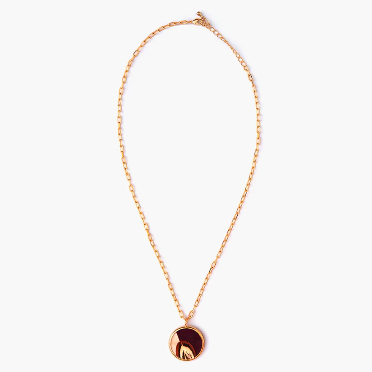 Subtle and chic, the Malu multicolor pendant is crafted with cream and burgundy turkey feathers with a pop of almond pheasant.
