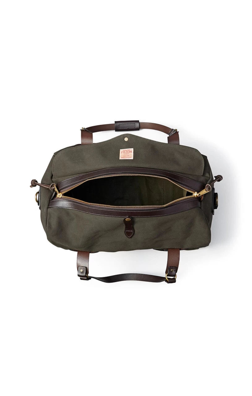 - Solid brass zipper closure custom cut at Filson with storm flap for added security