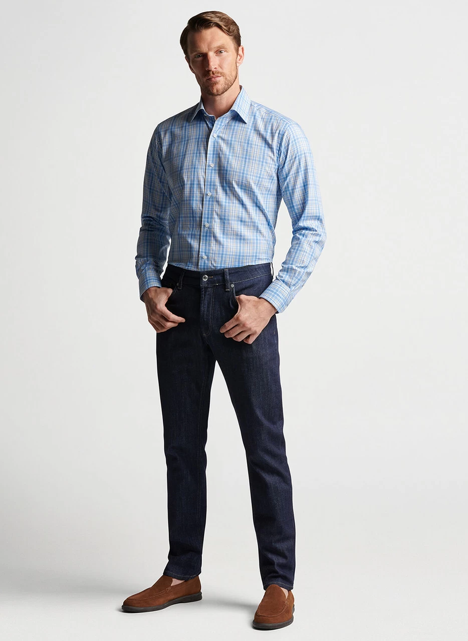 This refined sport shirt is fashioned from an exceptionally soft cotton featuring our innovative Flex Finish—a special treatment that elasticizes the natural yarns to provide stretch and enhanced comfort without the use of synthetic fibers. Finished with a spread collar, French placket, mother-of-pearl buttons and mitered cuffs.