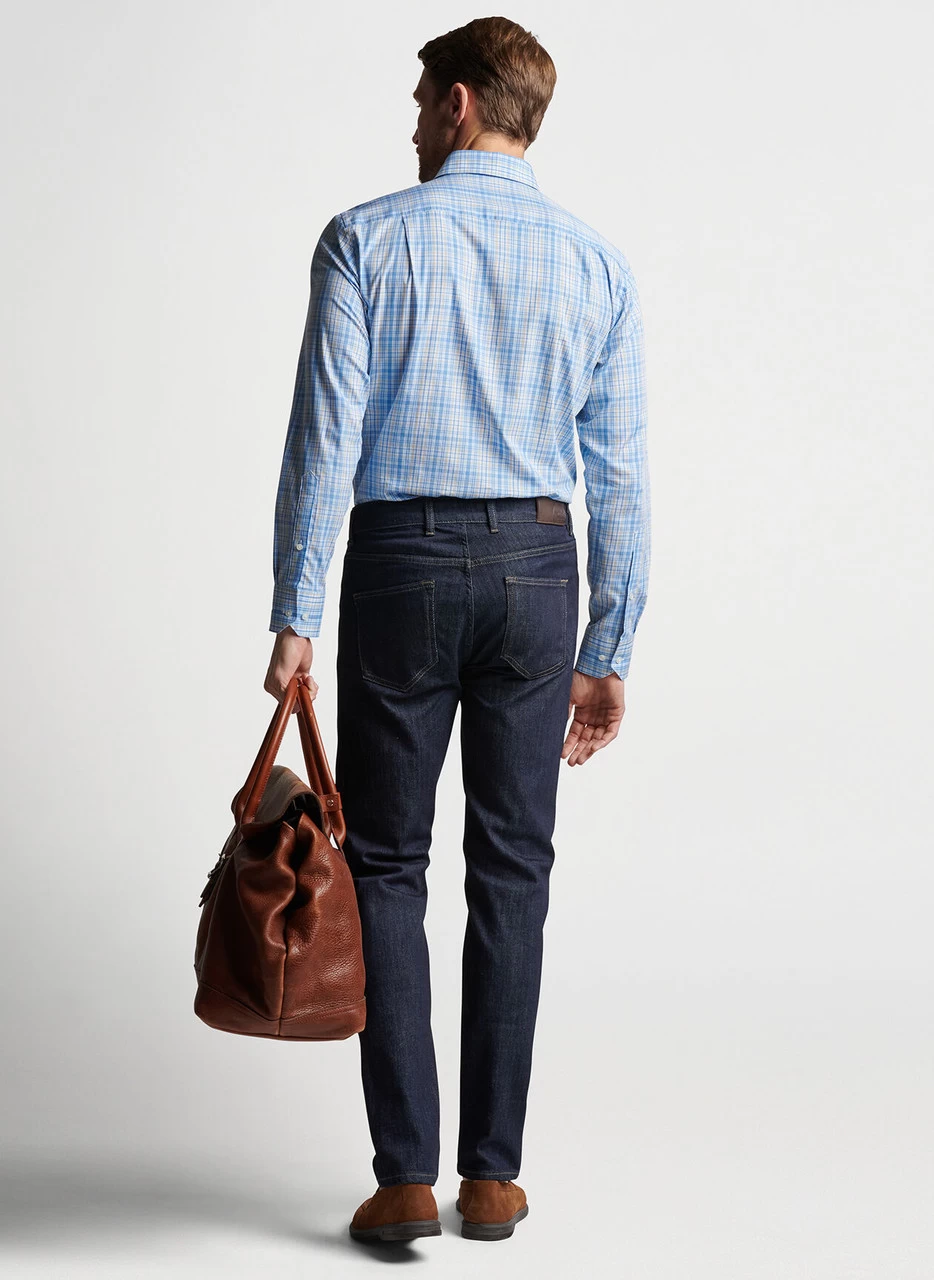 - Italian leather back patch, belt loops and a zip-fly button closure